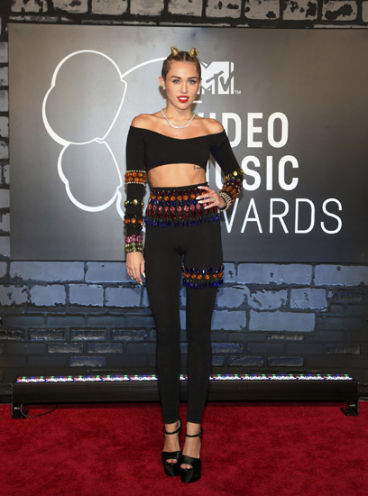 Miley Cyrus memilih setelan dari Dolce & Gabbana dengan crop top lengan panjang dan legging hitam dihiasi dengan ornamen berwarna-warni dipadu dengan sepatu dari Giuseppe Zanotti dan perhiasan Lorraine Schwarz.